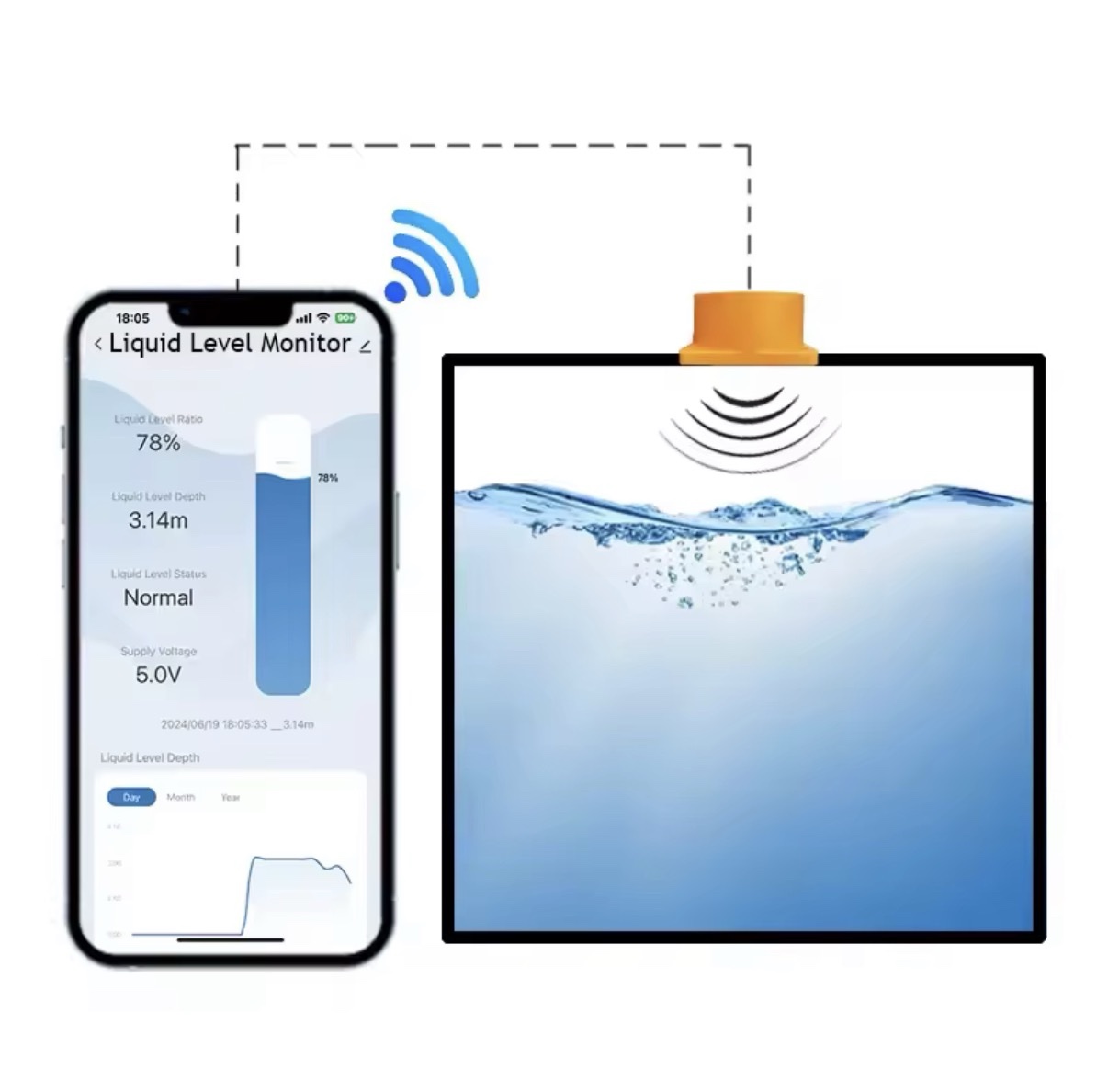 Dankzij ultrasone technologie meet de sensor nauwkeurig zonder direct contact met de vloeistof. Je ontvangt direct meldingen bij lage of hoge niveaus, waardoor je schade of tekorten voorkomt.